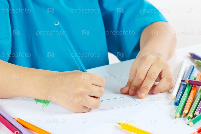 Детская рука с цветными карандашами крупным планом