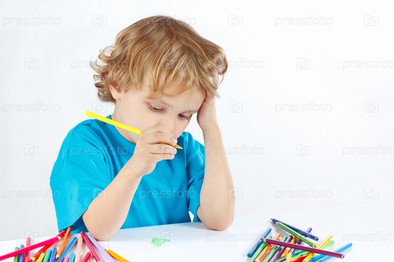 Милый ребенок рисует цветными карандашами на белом фоне