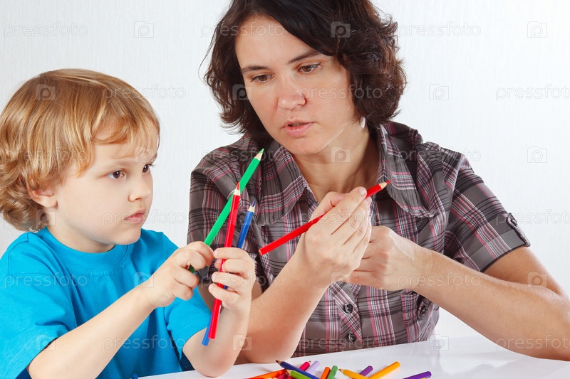 Молодая мать учит сына рисовать цветными карандашами на белом фоне