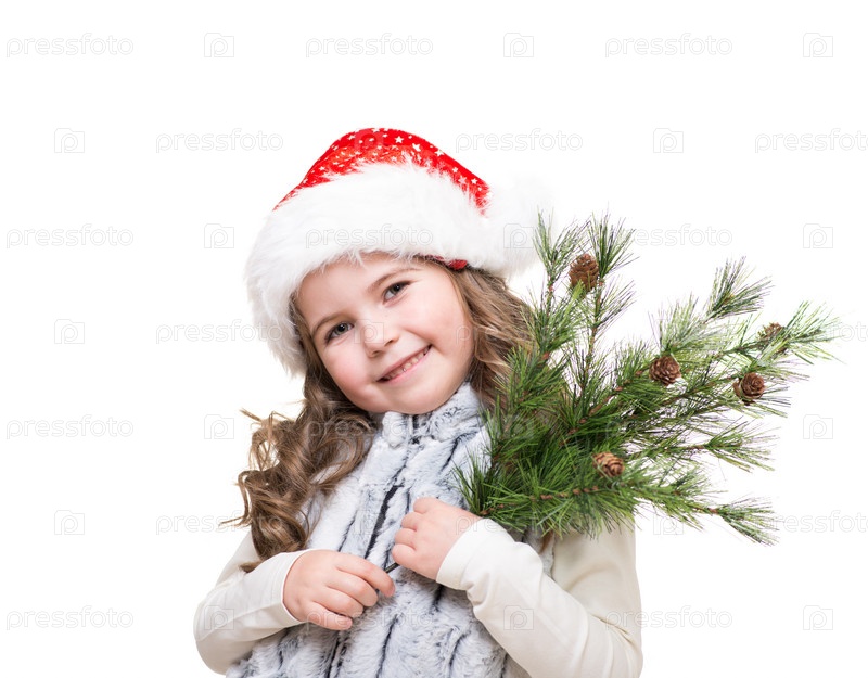 Девочка в колпаке Санта-Клауса с еловыми ветками