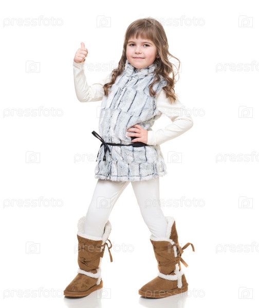 Маленькая девочка в теплой одежде позирует на белом