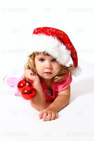 Рождественский ребенок играет с красными шариками, изолированный на белом фоне