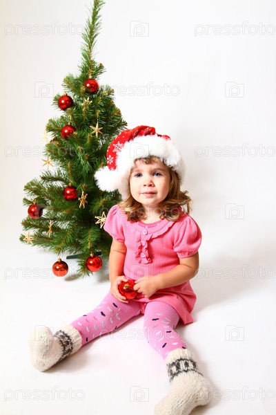 Милый ребенок в шапке Санта-Клауса и Рождественская елка, изолированные на белом фоне