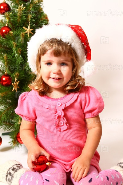 Милый ребенок в шапке Санта-Клауса и Рождественская елка, изолированные на белом фоне