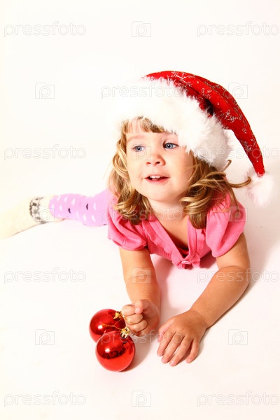 Рождественский ребенок играет с красными шариками, изолированный на белом фоне