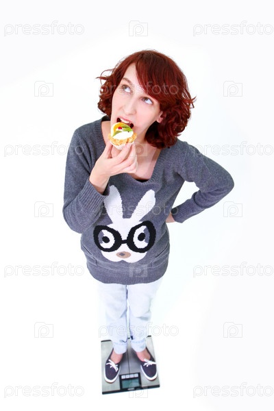 Молодая женщина стоит на весах и держит торт