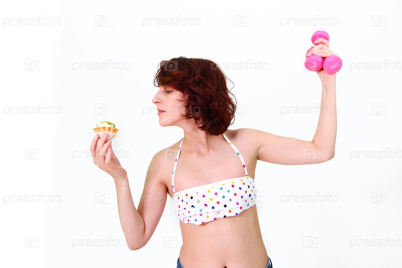 Молодая женщина с гантелями и тортом