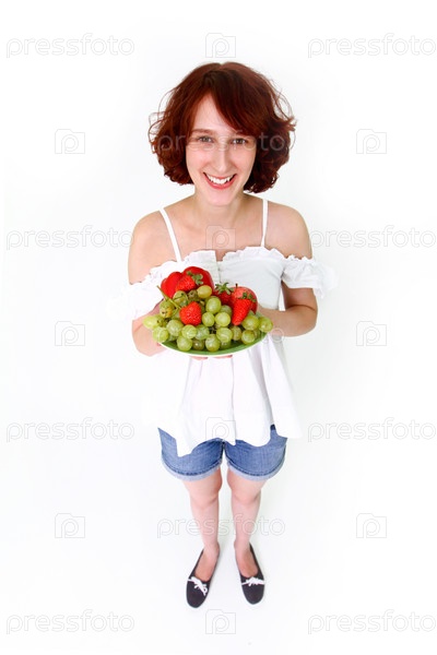 Молодая женщина с фруктами на блюде