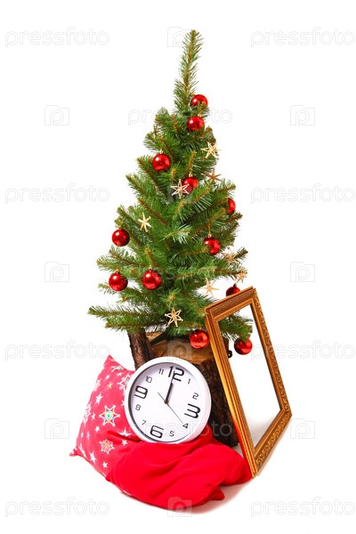 Рождественская елка на пне, подушка, зеркало и часы, изолированные на белом фоне