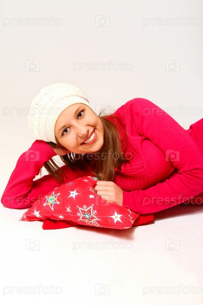 Молодая женщина в шапке и с подушкой, изолировано на белом фоне