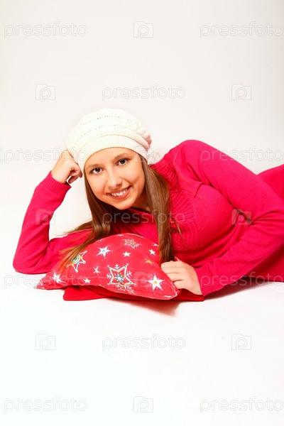 Молодая женщина в шапке и с подушкой, изолировано на белом фоне