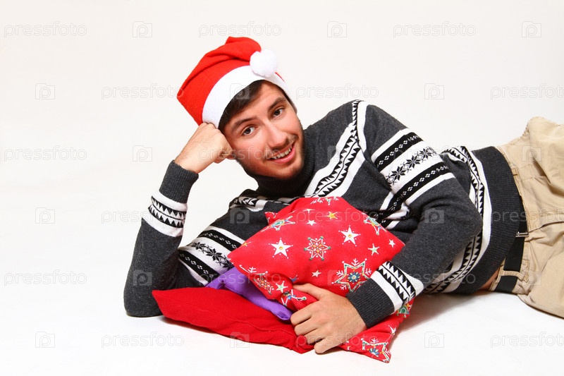 Молодой человек с колпаком Санта-Клауса и подушками, изолировано