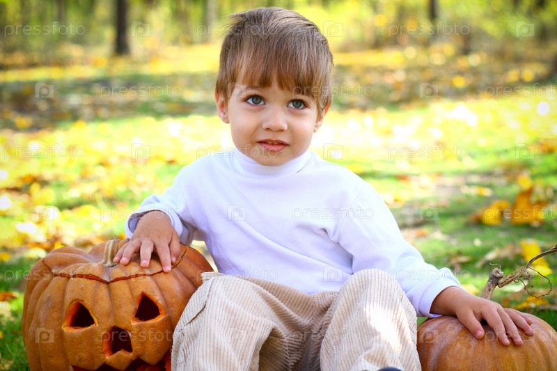 Маленький мальчик с двумя тыквами для Хэллоуина