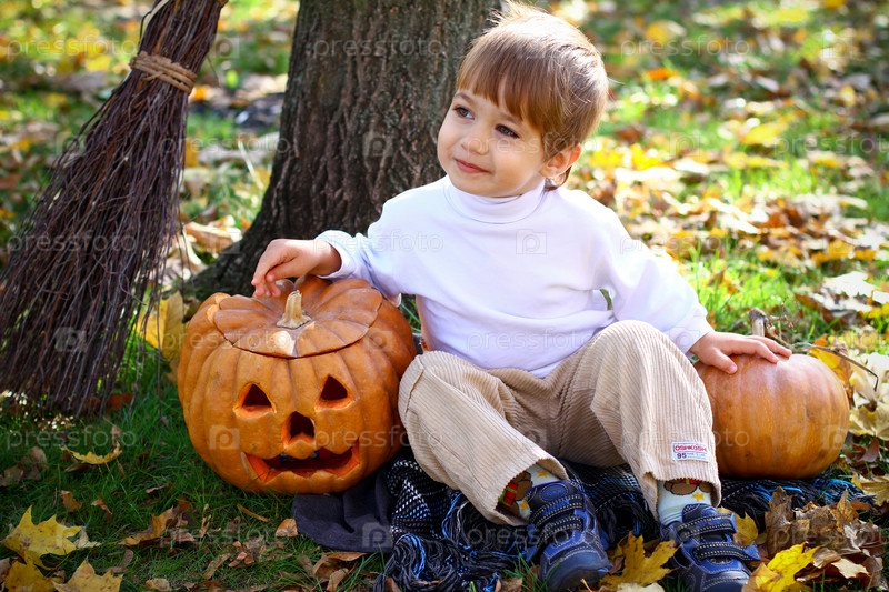 Маленький мальчик с двумя тыквами для Хэллоуина