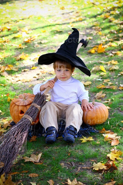 Маленький мальчик с тыквой, метлой и шляпой для Хэллоуина