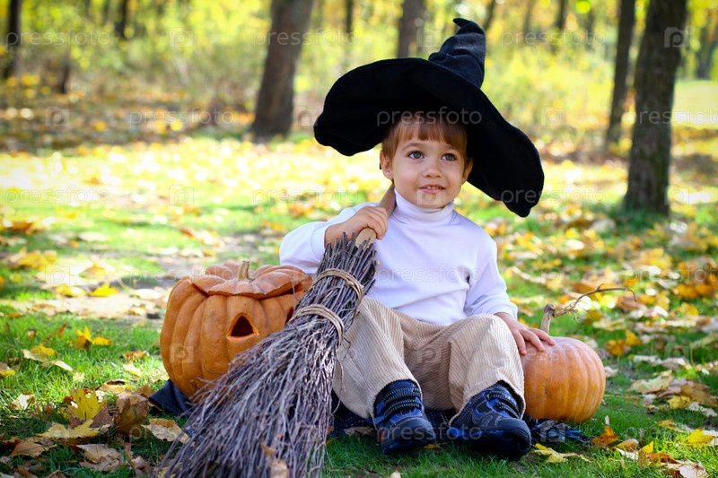 Маленький мальчик с тыквой, метлой и шляпой для Хэллоуина