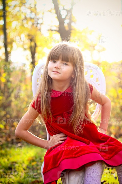 Милая девочка в осеннем лесу сидит на стуле