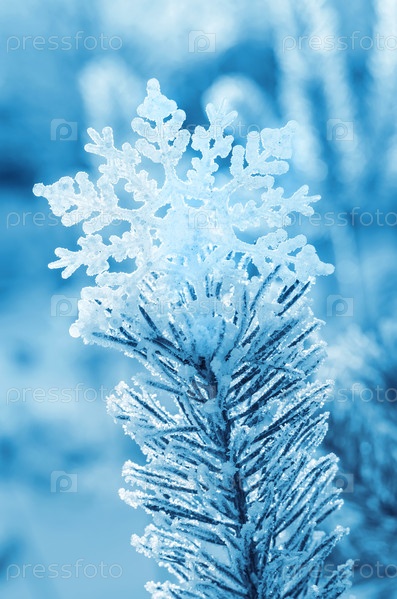 Верхушка дерева в инее со снежинкой