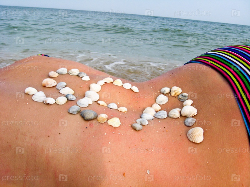 Надпись МОРЕ из ракушек на теле девушки