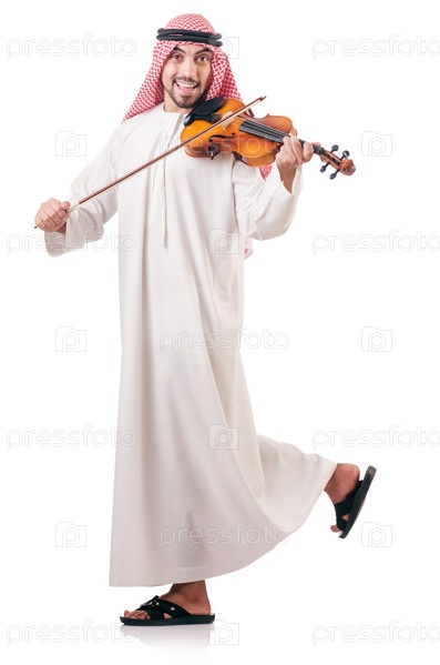 Араб играет на скрипке, изолированный на белом фоне