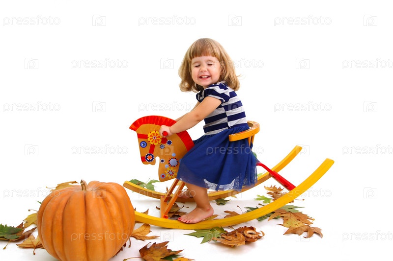 Улыбающаяся девочка на деревянной лошади, изолированная на белом фоне