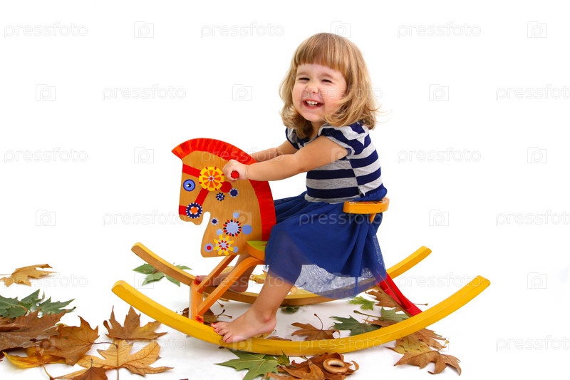 Улыбающаяся девочка на деревянной лошади, изолированная на белом фоне