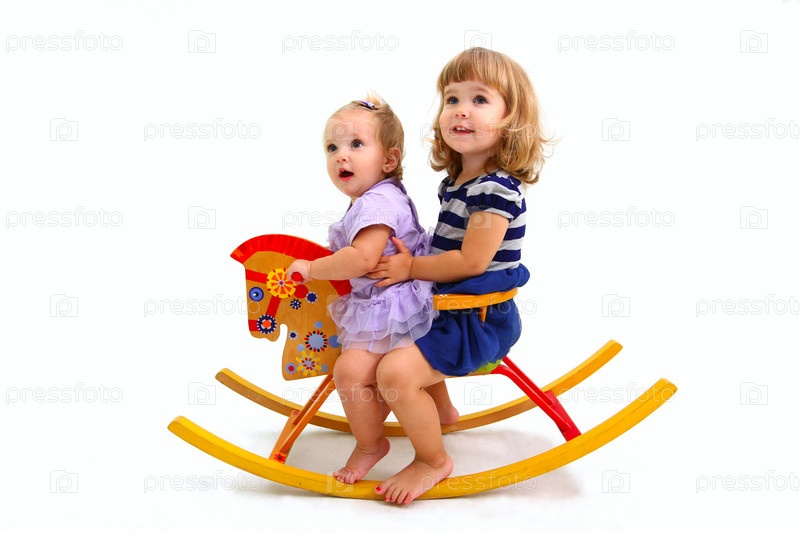 Улыбающаяся девочка на деревянной лошади, изолированная на белом фоне