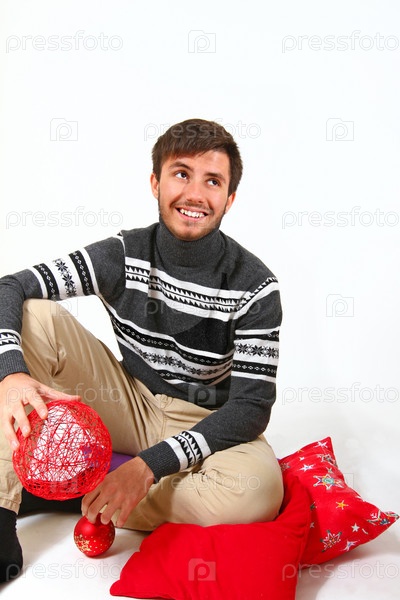 Молодой человек, сидящий с рождественскими подушками, изолированный на белом фоне