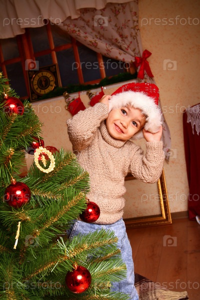 Счастливый мальчик в шапке Санты стоит возле елки