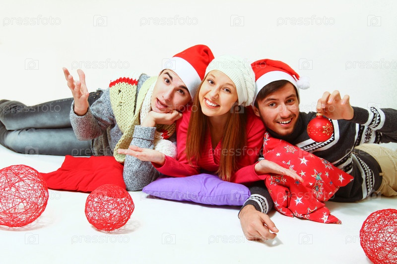 Мужчины и женщина в шапках Санта-Клауса показывают знак "нормально"