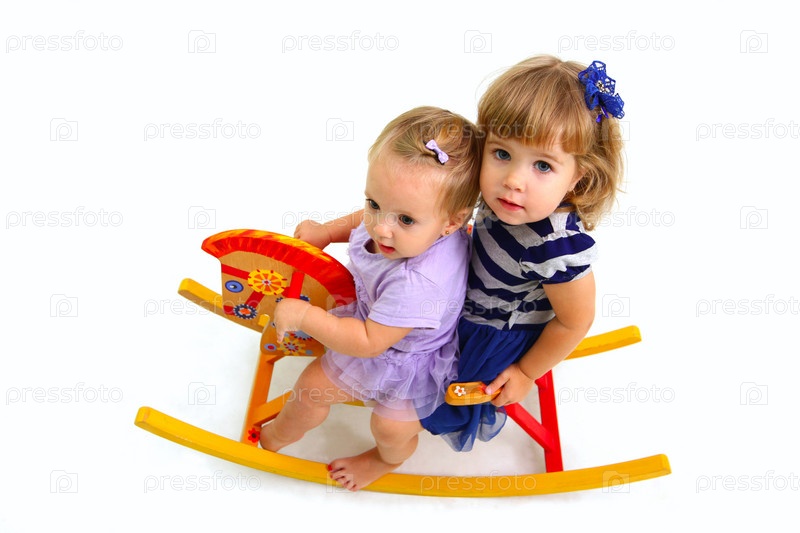 Две симпатичные девочки катаются на игречной деревянной лошади, изолированные на белом фоне