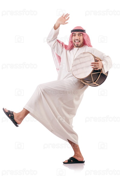 Араб играет на барабане, изолированный на белом фоне