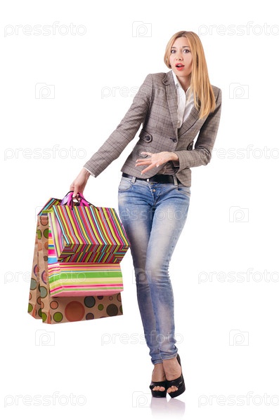 Привлекательная женщина после рождественских покупок на белом фоне