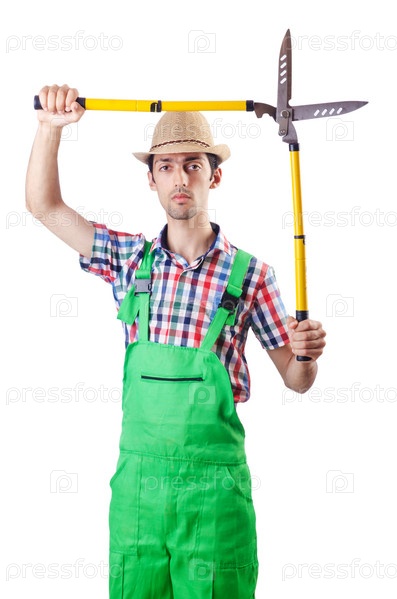Садовник с ножницами на белом фоне