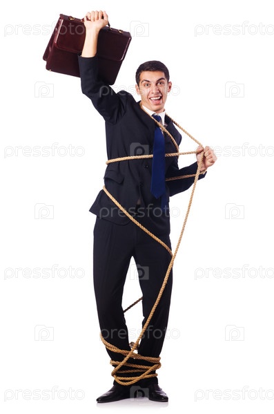 Бизнесмен, связанный веревкой, на белом фоне