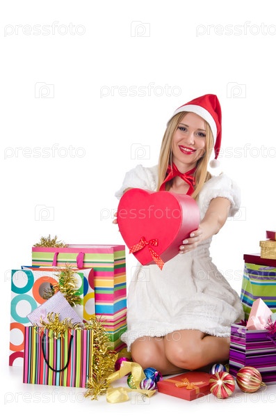 Привлекательная женщина после рождественских покупок на белом фоне
