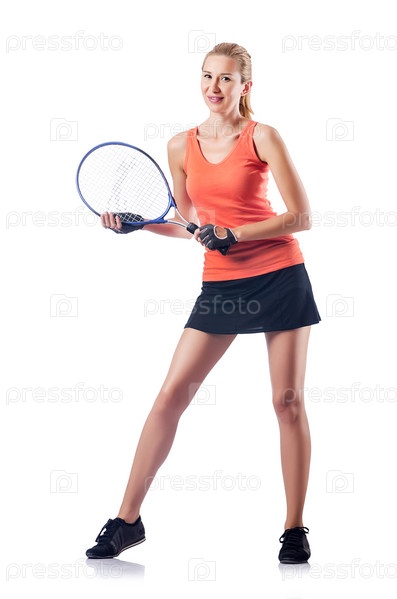 Женщина играет в теннис на белом фоне