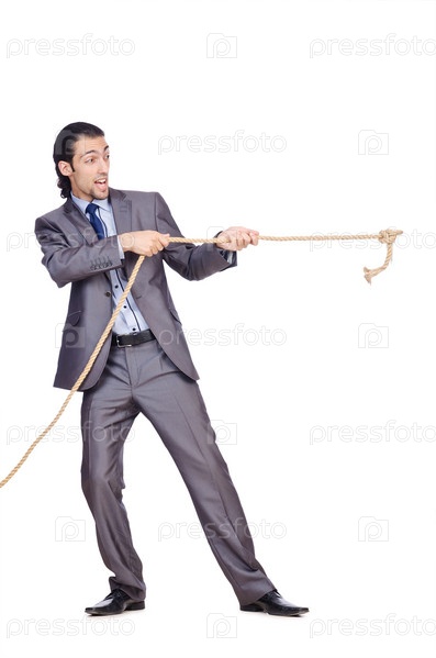 Бизнесмен тянет за веревку на белом фоне