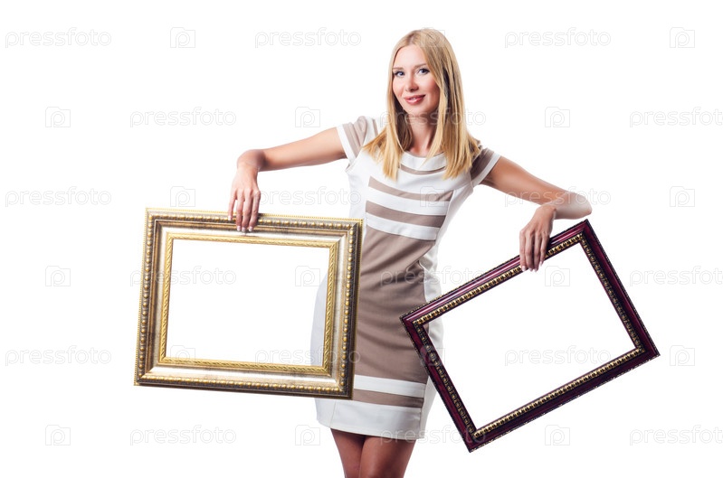 Женщина с фоторамками на белом фоне