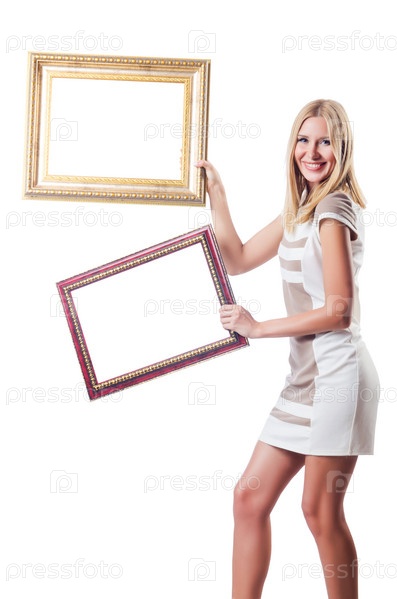 Женщина с фоторамками на белом фоне