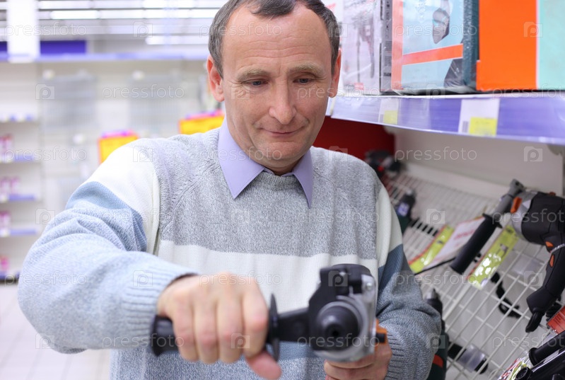 Пожилой мужчина в магазине с дрелью в руках
