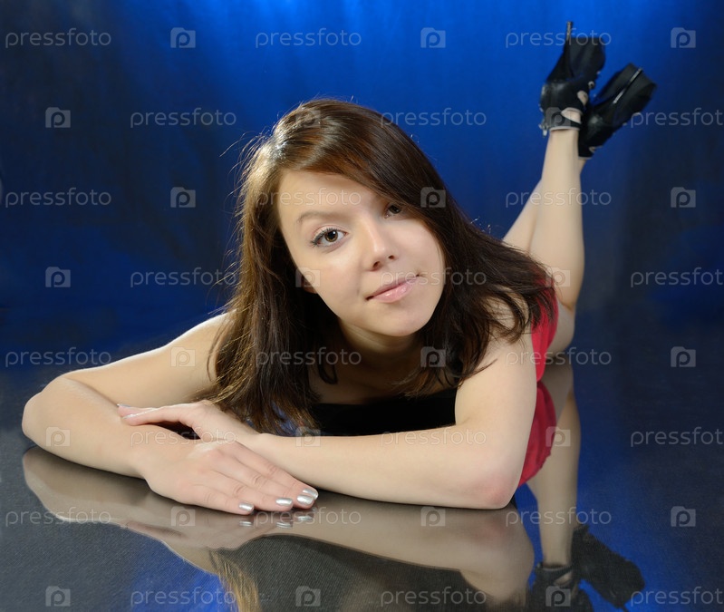 Задумчивая молодая девушка смотрит в камеру. На синем фоне