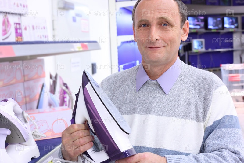 Пожилой мужчина в магазине с утюгом в руках