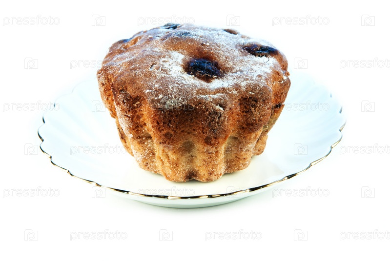 Черничный кекс на блюдце на белом фоне