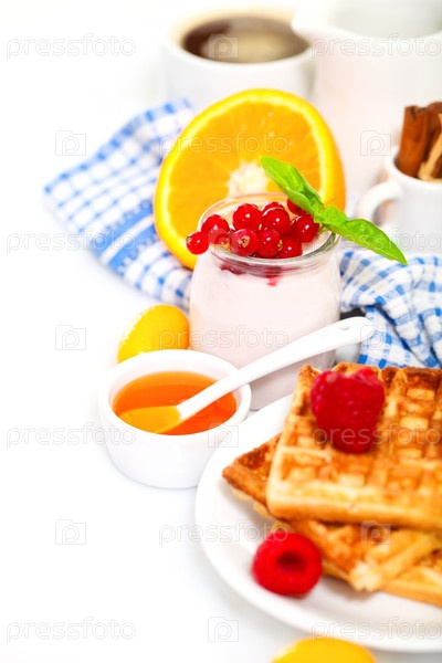Вкусный завтрак со свежим кофе, свежими вафлями и фруктами