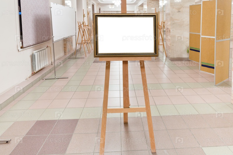 Рама из золотой древесины на мольберте в зале галереи