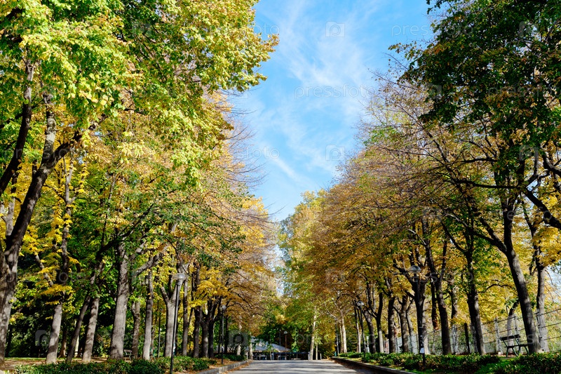 Желтые осенние деревья и синее небо в городском парке