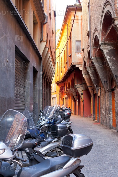 Парковка мотоциклов на старой узкой улице Болоньи