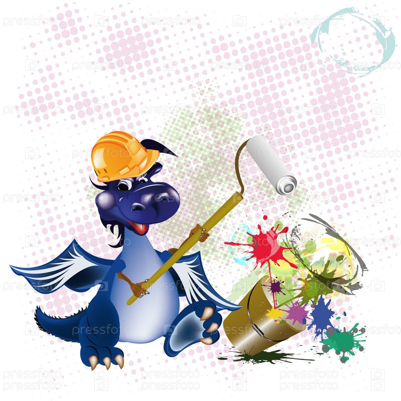 Синий дракон-маляр с разноцветными красками. Концепция ремонта