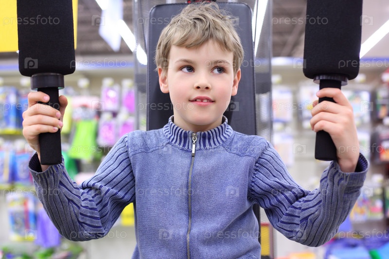 Мальчик в спортивном магазине на тренажере
